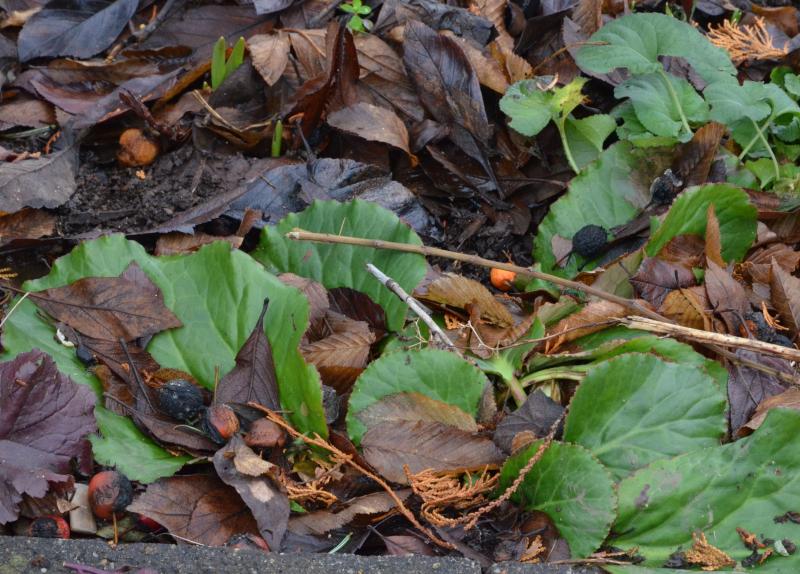 Als Ersatz für die Buchshecke im Vorgarten hatte ich letztes Jahr u.a. Bergenien am Weg gepflanzt.