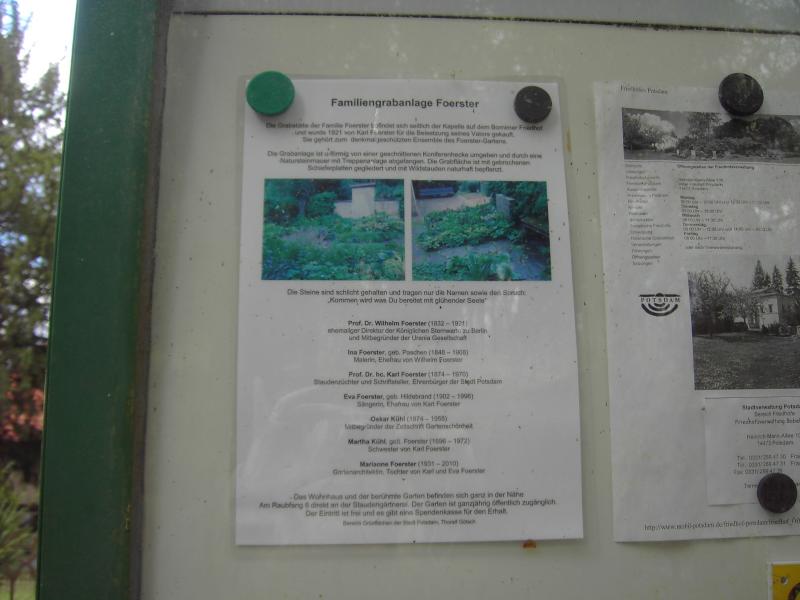 Die recht große Grabanlage liegt auf dem kleinen Dorffriedhof von Bornim und wurde, wie man auf einer Infotafel am Eingang von Friedhof erfährt, von Karl Foerster 1921 anlässlich des Todes seines Vaters Wilhelm Foerster angekauft.