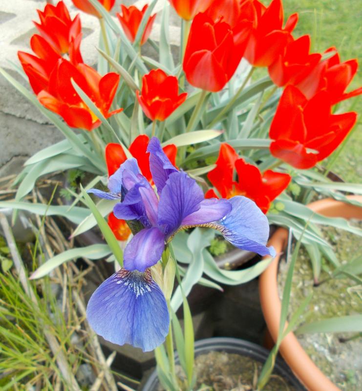 Iris sanguinea ex Mongolei vor Tulipa vvedenskyi. Etwas schräge Kombination, aber so stehen die Kübel halt 8)