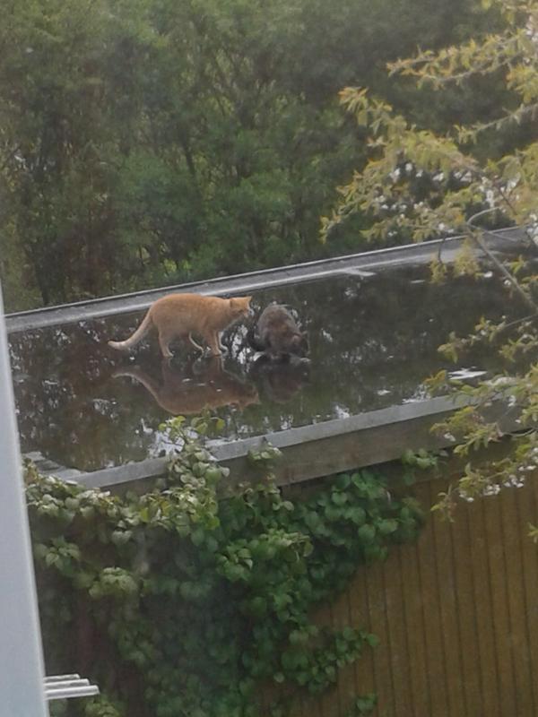 Dann wurden heute die Eingangsstufen neu aufgebaut weil sie nicht die richtige Höhe hatten. Verabschiedet wurde sich mit den Worten: Bitte bis übermorgen nicht drauftreten und achten Sie auf ihre Katze. Also hat Liese Stubenarrest. Was natürlich Nachbars neue Katze überhaupt nicht interessiert. Schließlich muss Katze ja wissen, was bei uns so in der Küche los ist. Das Ergebnis sieht so aus: