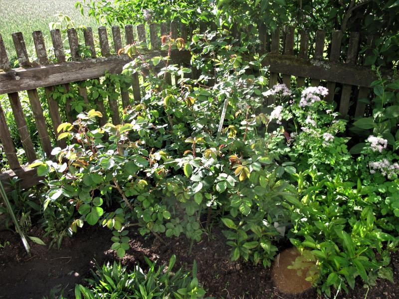 Parfum de L'Hay ist mir vor Jahren auf der Seite von Christine Meile aufgefallen, sie hat irgendwo über sie geschrieben, daß dies eine besonders geliebte Rose sei, obwohl sie nie mehr als ein paar Blüten auf gakeligen Trieben hätte und zu Blattkrankheiten neigte (so in etwa). Auch bei mir war das ca. 12 Jahre so, allerdings war sie wenigstens gesund (die Rugosas mögen offenbar den Waldviertler Granit), aber jede Blüte war eine Kostbarkeit an Duft und Farbe. Schon im letzten Jahr hatte sie offenbar beschlossen, sich zu erweitern, und heuer scheint sie geradezu zu expolodieren. Sie steht in einer Ecke des Gemüsegartens, hab am WE in Vorfreude ein - schnelles, schlechtes - Foto gemacht:
