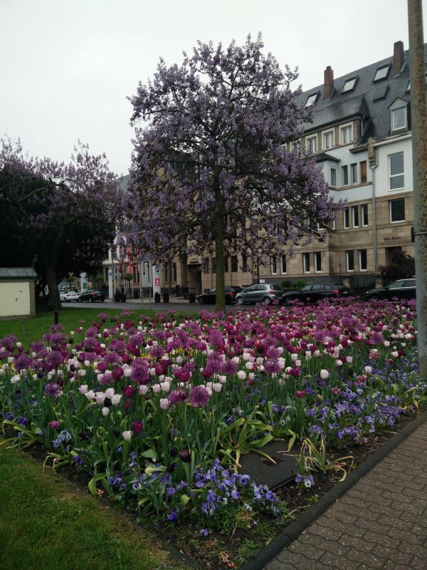 In Koblenz gibt es zur Zeit schön bepflanzte Beete in dezenter Kombi: Tulpen in Lila- und Purpurtönen, dazu Allium, hellgelbe Hornveilchen.