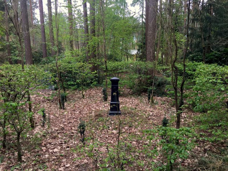und die säule ist ein vor vielen jahren vor der steinmühle und einem schnöden ende als tragschicht im wegebau geretteter eckpfosten einer alten gittergrabeinfassung, vermutlich aus syenit, poliert.