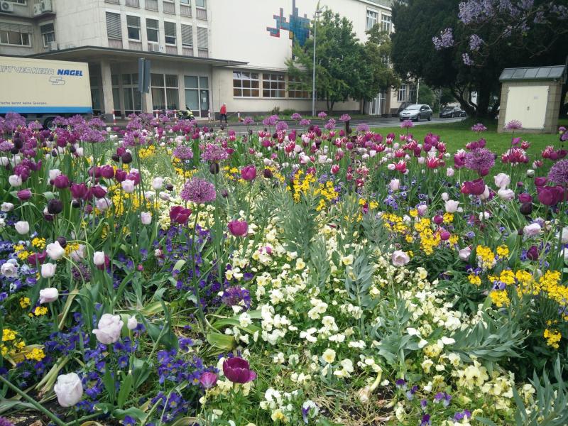 In Koblenz gibt es zur Zeit schön bepflanzte Beete in dezenter Kombi: Tulpen in Lila- und Purpurtönen, dazu Allium, hellgelbe Hornveilchen.