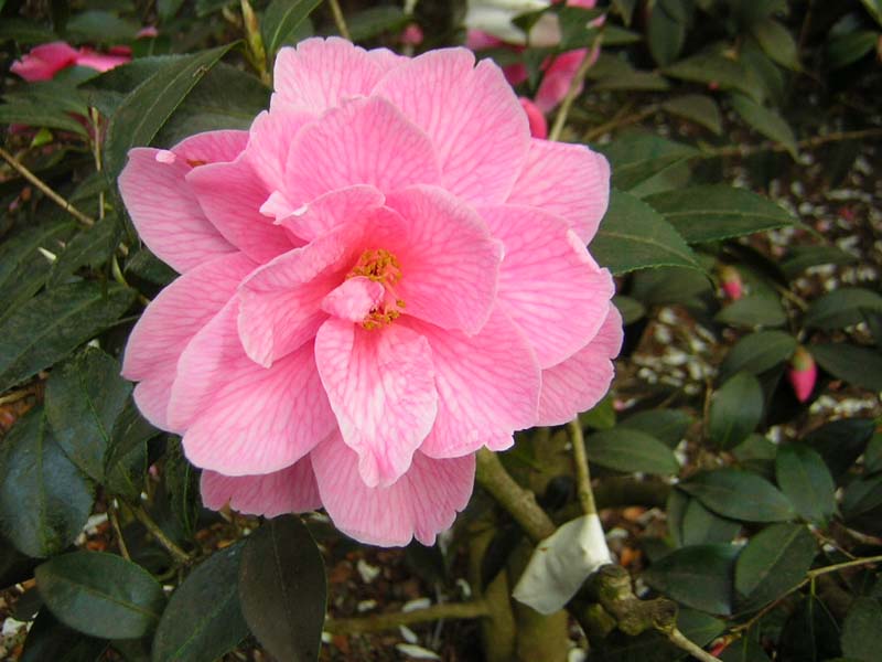 Das ist mir eigentlich noch nie so richtig aufgefallen, dass die recht populaere (weil winterharte) Williams-Kameliensorte 'Donation' so eine geaderte Bluete hat. Schoen, nicht wahr?Die Kamelien bluehen hier schon seit Monaten und es ist kein Ende abzusehen. Eine schoener als die andere!