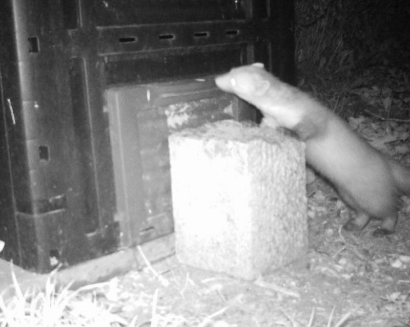 Und ein anderes Tier besucht uns auch öfter in der Nacht. Wir vermuten, dass es ein Wiesel ist. Es hat die Größe eines Eichhörnchens und ist vermutlich braun. Leider sind die Fotos nicht übermäßig scharf.