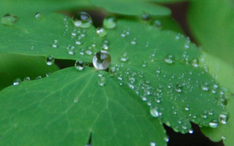 Kleine Diamanten auf einem gewöhnlichen Akeleiblatt. Der Garten lebt durch die Feuchtigkeit und leichte Wärme momentan richtig auf :D.