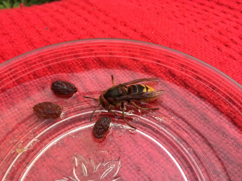 dann kam ich auf die idee, dass sie eventuell wasser und energie bräuchte, um zurück ins leben und zu kräften zu kommen – außer wasser, rohrzucker und rosinen habe ich nichts zur hand gehabt. getrunken hat sie sofort, und viel. irgendwann war sie dann weg, hoffentlich erfolgreich weggeschwirrt.
