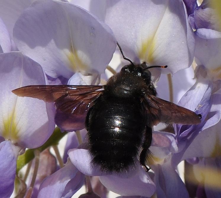 Bei mir ist zur Zeit fast immer eine Holzbiene am Blauregen neben der Haustür. Wenn man zur Tür raus kommt, schwirrt sie ab. Vorgestern habe ich es geschafft, sie zu fotografieren.
