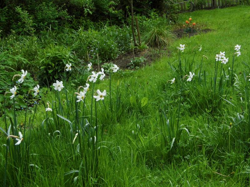 Bei mir pflanzt irgendjemand Tulpen um. So gleichmäßig hab ich die niemalsnicht verteilt. Kann ich gar nicht :-X ;) Bissl Blau gibts auch dazu.