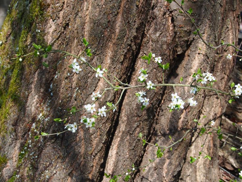 die Schlehen, Prunus spinosa, der Schwarzdorn blüht gerade. Vor der Vogel-Kirsche.