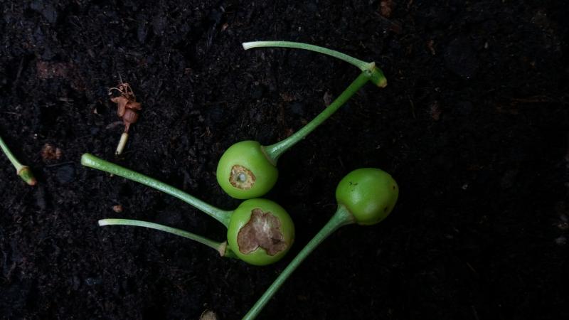 Die kleinen Kirschen wurden wahrscheinlich von einem Frostspanner angefressen.