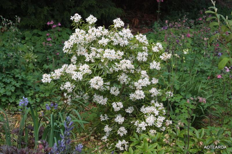 hier unser Rhododendron roxianum x ponticum Graciella, davor ein Sämling einer Päonia mlokosewitschii