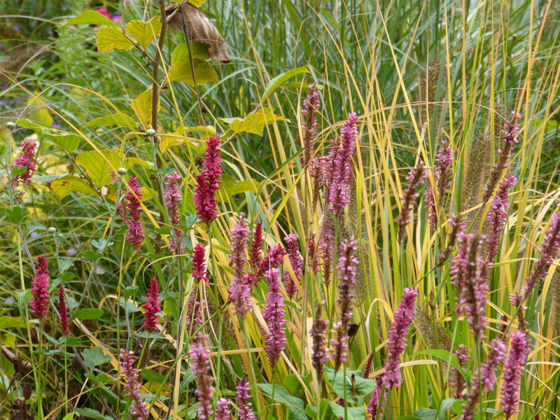 Persicaria filiformis färbt sehr schön. An dieser Stelle ist die Gefahr der zu starken Selbstaussaat auch eher gering.