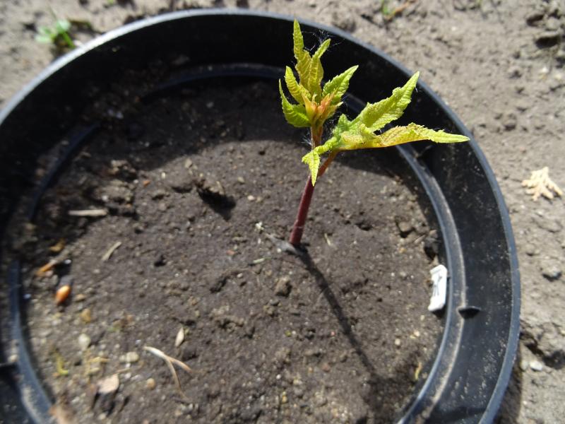 Aussaat: die kleine Samen zwisschen leicht feuchtem Küchenpapier in ein zip lock Tüte für etwa 6 Wochen in der Kühlschrank, danach am 24. März 2017 die Samen im Topf gesät und draußen gestellt.