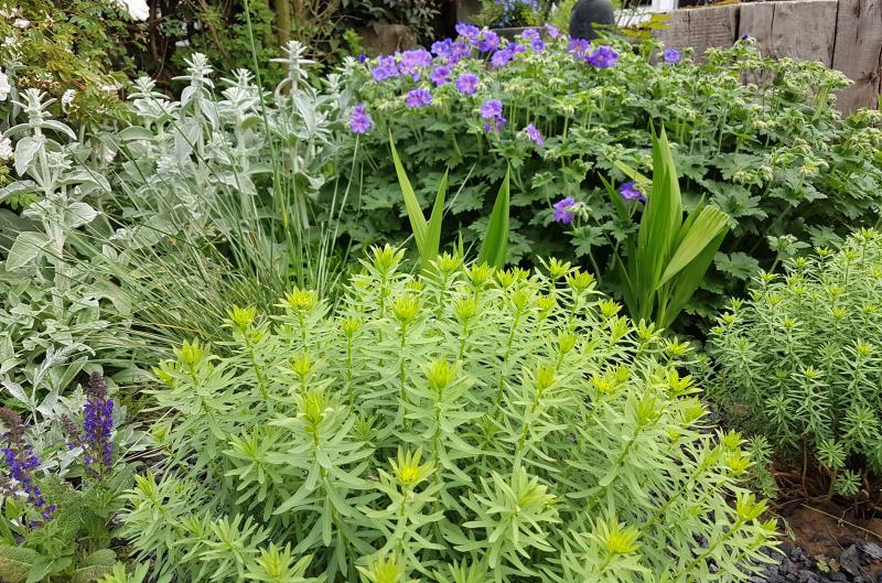 Ich freue mich schon auf die Blüte der Steppenwolfsmilch. Hoffentlich schafft sie es noch mit dem Storchschnabel zusammen.