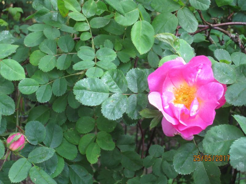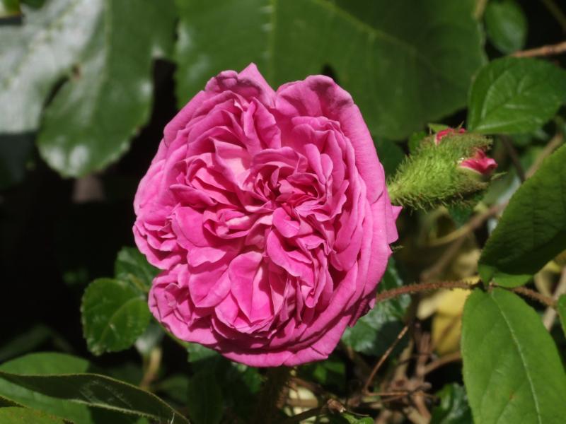 Die Blüten sind dann eher flach, kräftig rosa und ~ 7cm im Durchmesser, mit schönem Duft. Der Wuchs ist bogig-überhängend, in Frankreich etwa 1,2 m hoch. Derzeit durchforste ich meine Rosenliteratur in der Hoffnung, die Sorte zu bestimmen.