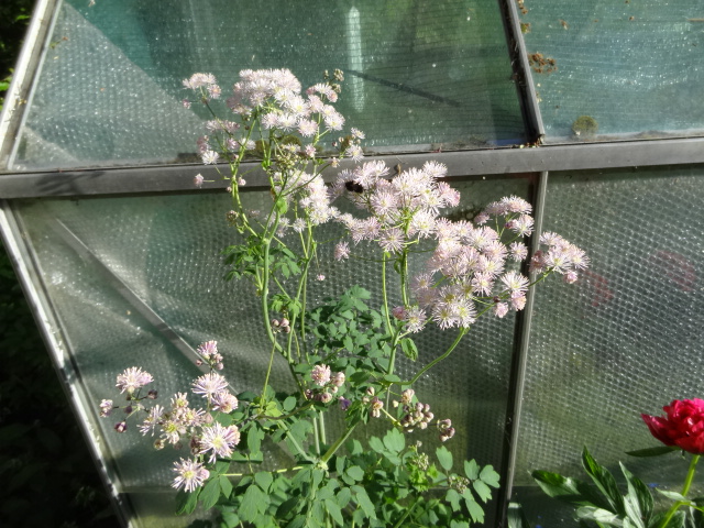 Clematis recta purpurea blüht hier auch fast und ist dieses Jahr auf überraschende 1,70 m gewachsen.