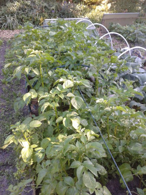 Meine Kartoffeln stehen ganz gut in diesem Frühling. Es hat lange gedauert bis die im April gelegten zum Vorschein kamen bei der Kälte, aber seit sie die Köpfe rausragten haben sie keinen Frost mehr bekommen.