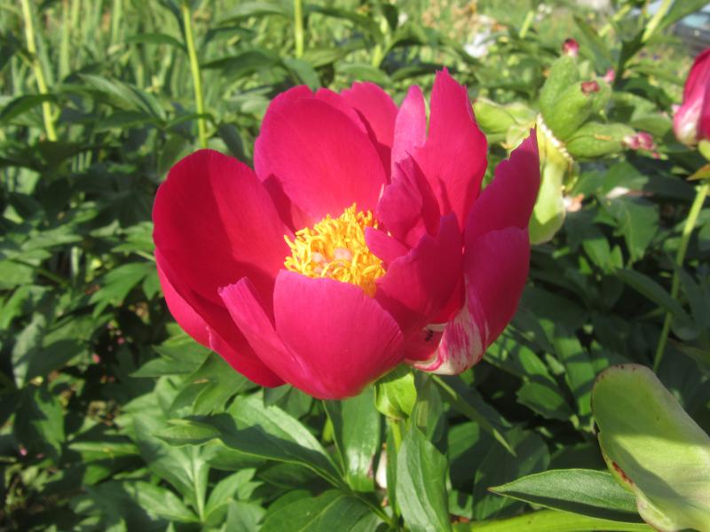 Nebenblüte von `Cardinal Robe´, diese Hybride hat netterweise genug Lactiflora-Blut abbekommen, um sich zu verzweigen. Die Hauptblüten waren angerfrostet und dadurch unnatürlich, entweder übelblaurosa oder weißlich.