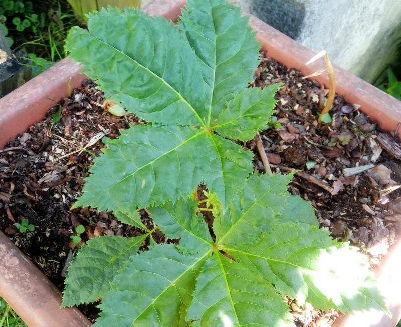 Hier ist mein Sämling einer rotblühenden Rosskastanie. Die Blattränder sind doch sehr interessant.