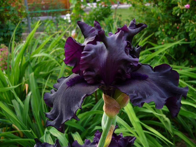 die farbe vom vorigen bild ist zu hell, und man sieht die eigentümlich geschwungenen fast leicht verzwirbelten blütenblätter nicht. leider bekomm ich das mit den fotos nicht hin. ich echt wirkt das ziemlich beeindruckend, vor allem da die rückseite stark schärzlich glänzt. auch die knospen sind schon sehr auffallend eng gewickelt und bilden glänzende spitzen bevor sie sich öffnen, ganz anders als die anderen dunklen iris die ich bisher gesehen habe. ich hätt die sorte ja "batman" genannt