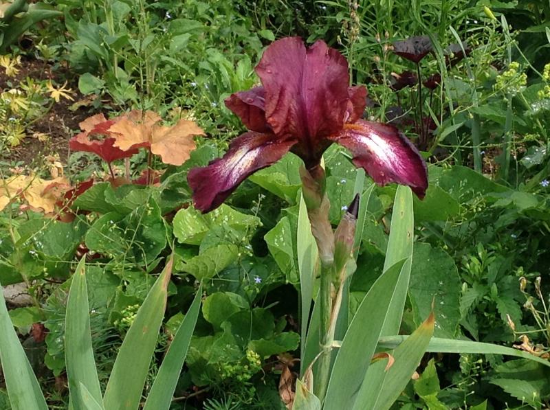 Nach dem Neupflanzen letztes Jahr besitze ich nun drei Iris, die ich zusammensetzen möchte, wegen der ähnlichen Farbe, dunkelrot, bräunlich, ins Dunkelviolett gehend. Dazu suche ich eine Pflanze, die jetzt, Ende Mai, Anfang Juni, am besten aussieht, niedriger als die Bartiris ist und, am allerwichtigsten, sehr hellgrün oder gelbgrün ist /blüht. Hellgrün kann die Blüte oder auch die Blattfarbe sein.