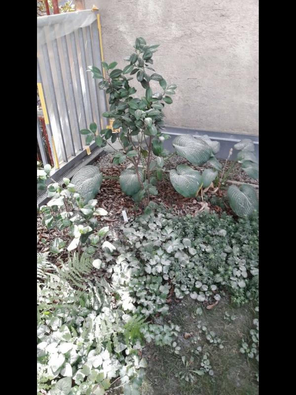 Hilfe!!! Durch eine Baustelle im Nachbarhof sind meine Kamelien über und über mit feinem Staub bedeckt. Vermutlich stark kalkhaltig. Ich bin erst am Samstag wieder in Wien, meine Nachbarin hat mir das Foto geschickt und spritzt sie nachher ab.
