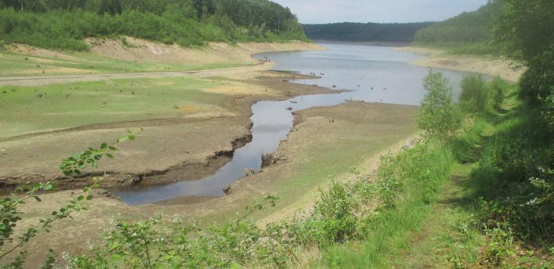 Gestern beim Pfingstausflug an unserer Trinkwasser-Talsperre vorbeigekommen. Sie ist nicht mal mehr zu 30% gefüllt, so leer habe ich sie noch nie gesehen. Zum Größenvergleich: Die kleinen Punkte am Ende der (normalerweise versunkenen) Strasse links oben im Bild sind Leute.
