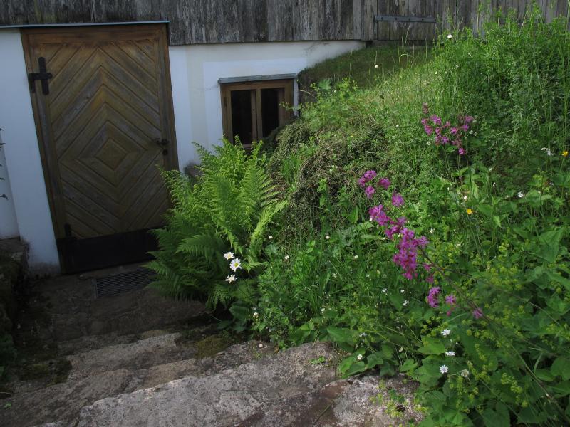 Am Hintereingang auf der Nordseite herrscht das Recht des Stärkeren, dort greif ich nur später im Jahr ein, wenn mehr Zeit ist und etwas zu sehr überhand nimmt. Ursprünglich habe ich dort Pflanzen aus der Wiese und von den inzwischen komplett verschwundenen Rainen hingesetzt wie z,B. Stein(Karthäuser-) nelken, gewissermaßen auch dort als Übergang zur Natur. Einiges ist von selbst dazugekommen wie die beiden Wurmfarne, das Labkraut u.a. Allerdings stehen ganz oben rechts und links Rosen Louise Bugnet und noch weiter rechts Lykkefund im Ringlottenbaum, die den Besucher mit Duftwolken begrüßen ;):