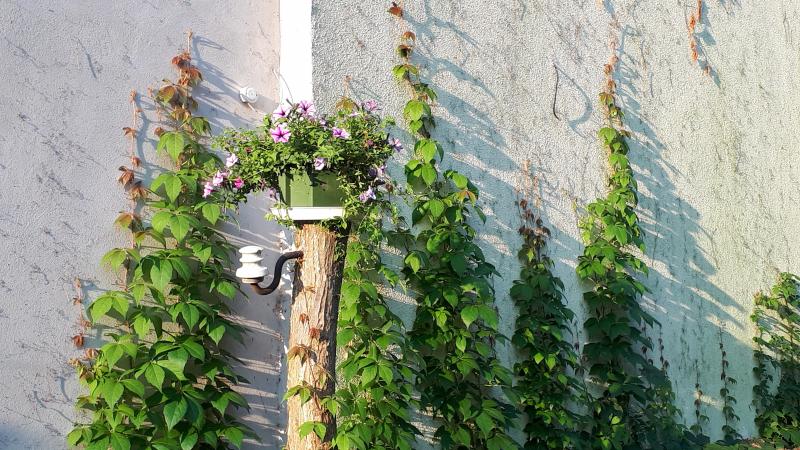 Auch das sehe ich von dort - wir haben eine Ulme direkt an der Nordwand der Nachbarn gekappt. Das sah richtig nackig aus - da habe ich aus Gag einen bepflanzten Milchkübel draufgestellt... Das sah so doof aus, dass es schon wieder witzig war. Inzwischen arbeitet sich der Wein wieder hoch (der muss aber wieder runter.... die Nachbarin will ihn nicht....) Aber es sieht irgendwie lustig aus...