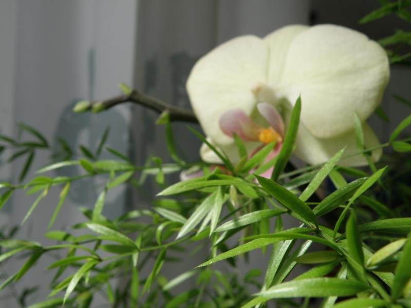Mein A. 'Mazeppa' hat sich seid der Threateröffnung ganz prima im Bad gehalten. Nicht ein Trieb musste abgeschnitten werden und im Moment "zärtelt" er mit einer Phalaenopsis Wange an Wange :D