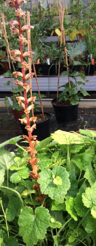 Und kurz darauf fand ich im nächsten Gewächshaus eine Orobanche (sieht auch aus wie hederae)in einem Topf mit Tolmiea. Die will mich wohl veräppeln.