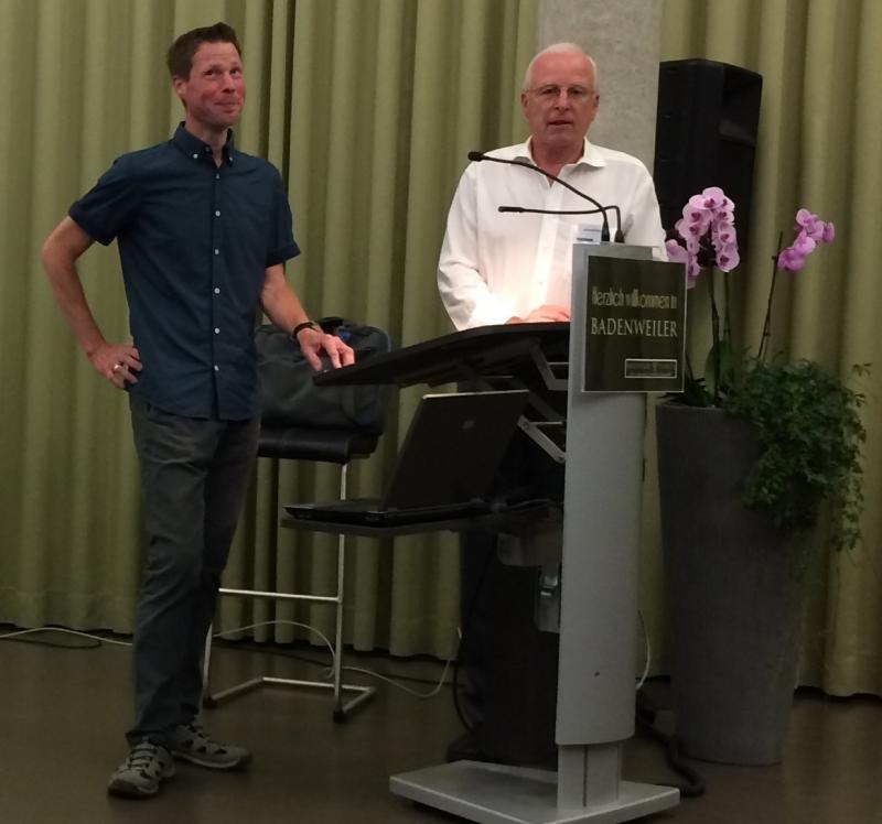 Das Highlight des Tages war dann der Beitrag von Herrn Dörken. Dem hätte ich den ganzen Tag zuhören können, mit seiner Mischung aus Kompetenz, Verve und Freude am Thema, hier auf demFoto zusammen mit Hubert Nimsch, dem ehemaligen Leiter des Arboretums Güntersberg bei Freiburg, um das es beim Vortrag ging. Die Führung dort ist nur zu empfehlen.