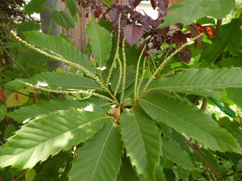 Seltsamer Weise haben meine Maronensämlinge kaum unter den Spätfrösten gelitten. Die sind noch im Topf und standen im Folientunnel überdacht, doch die Giebelseiten sind offen. Ohne Sonne ist es da drin genauso kalt wie draußen, nur windgeschützter. Nur 2 Sämlinge hatten leicht frostgeschädigte Blätter. Bei den anderen Sämlingen kamen entfalteten sich die Blätter ohne erkennbare Schäden. Einer davon blüht jetzt schon das 2. Jahr. Früchte wird es keine geben. Er ist der einzige Blühende.