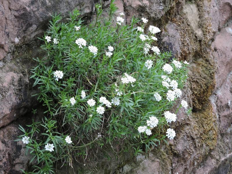 Die Schleifenblume wächst schon lange an der Mauer, allerdings in einem kleinen Loch. Hat sich aber auch schon in Fugen versamt. Blüte war schon besser, vielleicht ist`s ihr auch einfach zu trocken.
