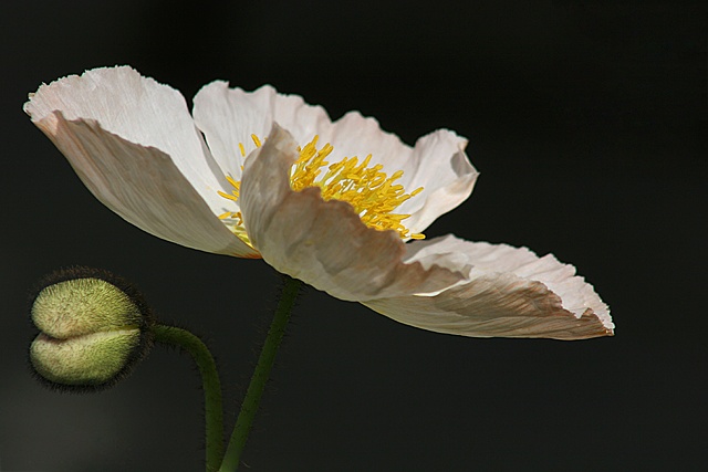 Das sind ja ungewöhnliche Ranunkeln in Deiner rosa Komposition, habe ich noch nie gesehen. Den Mohn habe ich gestern irgendwo in einem Kübel gefunden, vielleicht war er vorkultiviert. Die Knospenhüllen sind so schwarz behaart, also keine EBV-Erscheinung. Bei dem Bild vom Mohn im Gegenlicht heben sich die Härchen besser den Hintergrund ab. (Interessanterweise sehe ich erst hier an den Blütenblättern einen rosa Schimmer, in der grellen Sonne hätte ich schwören können, sie seien weiß.... )Liebe Grüße, Artemisia