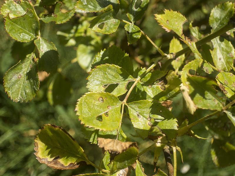 Vor ca. 1 Jahr habe ich ein kleines Rosenstämmchen gepflanzt. Die Sorte weiß ich nicht mehr. Die Blätter sind sehr klein und die Blütenfarbe ist rot. Als ich die Rose kaufte, war sie gesund und hatte dunkelgrüne Blätter.