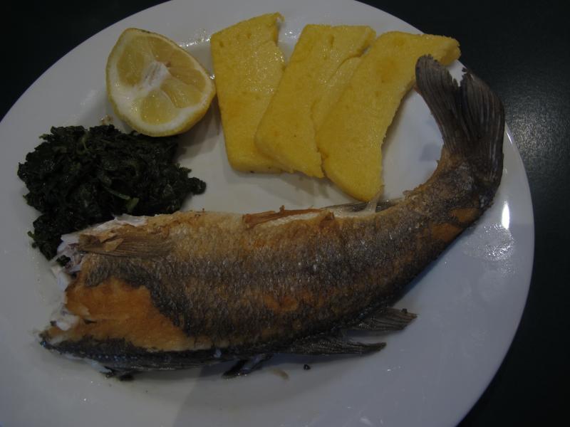 Bei dem mediterranen Wetter lockten heute frische Branzinos/Wolfsbarsche an der Fischtheke -in Kroatien gezüchtet, schmeckten wie Wildfang, ohne den gewissen Beigeschmack. Je eine Knoblauchzehe und ein kleiner Rosmarinzweig im Bauch und in der Pfanne gebraten, waren sie so gut wie lange nicht. Dazu klassisch Polenta und Spinat.