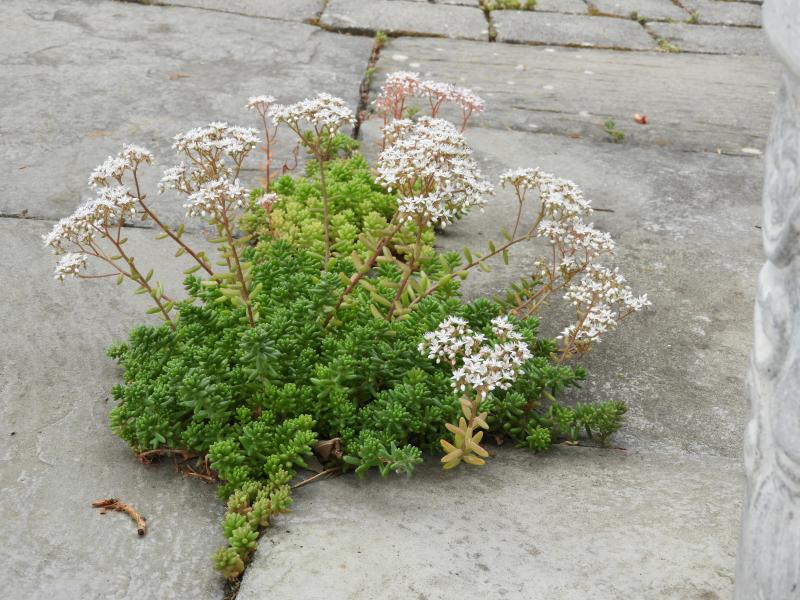 Dass sich Sedum album so bereitwillig verteilt, mal hier, mal da kommt sicher auch vom Wischen mit dem Besen. Hier profitiert es vom Restwasser, das aus dem Topf abfliesst.