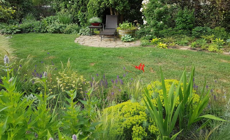 Das neue Beet vor der Terrasse, fügt sich schon ganz schön in das Gärtchen ein.