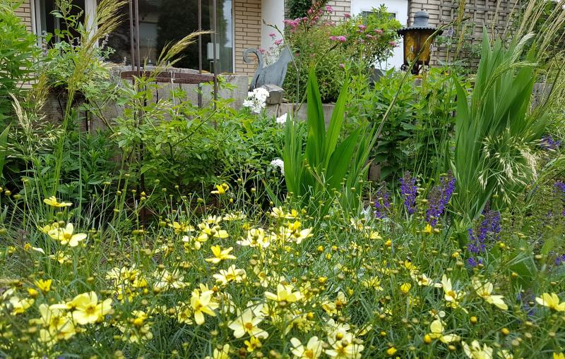 Im Vorgarten blühen üppig die orangenen Taglilien und die Mädchenaugen, auch meine Margerite ist trotz Trockenheit im Frühling recht groß geworden. Den Kirschlorbeer im Hintergrund habe ich neulich aufgeastet, weil er die umliegende Bepflanzung zu erdrücken drohte, deshalb sieht es dort im Moment etwas löchrig aus, weil sämtliche Stauden dort umgekippt sind und irgendwo am Boden herumkrebsen.