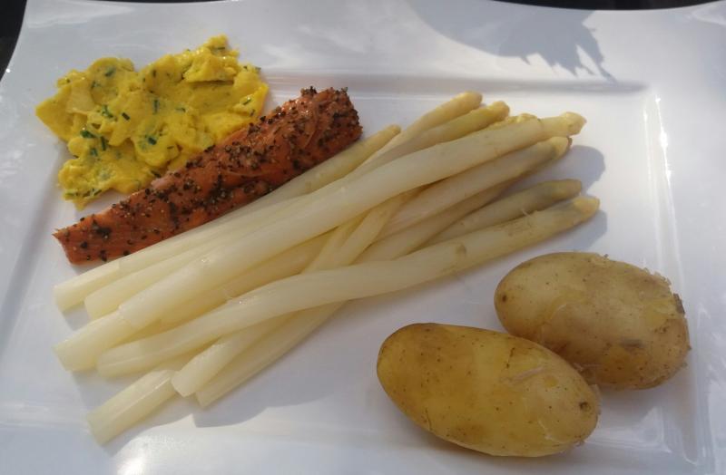 Hier gab es in den letzten Tagen Spargel mit Frühkartoffeln, Stremellachs und Rührei,