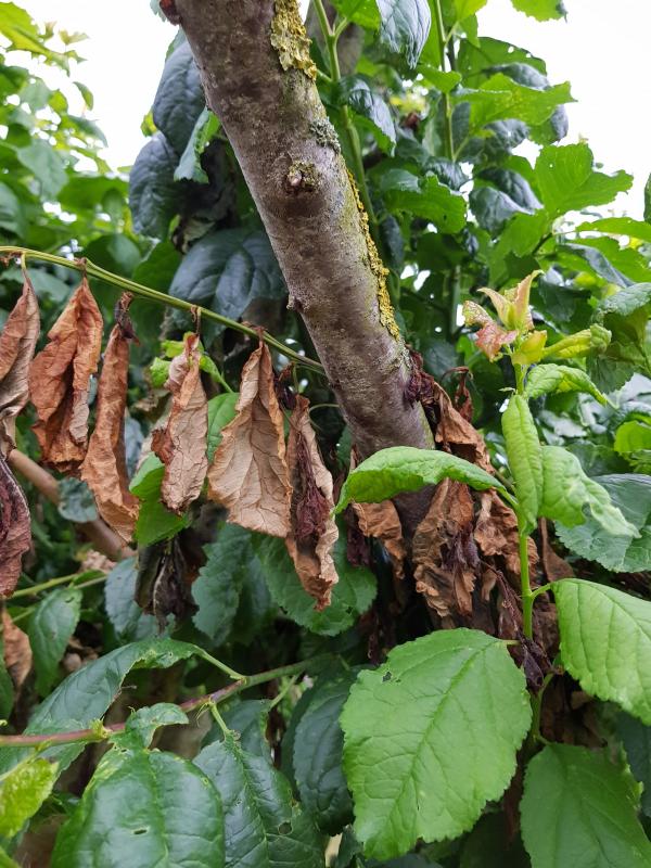 Es sind noch ein paar Zweige wo die Blätter gekräuselt sind oder schon abgestorben sind.