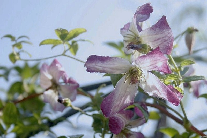 Bei meinen Versuchen heute Morgen war das das Hauptproblem, ein Motiv zu bekommen, das nicht ein Durcheinander zeigt. Ich zeige hier mal eines der Bilder. Bei mir wachsen Clematis viticella ´Luxuriant Blue´ und C. flammula ´Rubra Marginata´ durcheinander. Auf diesem Foto hat die C. flammula allerdings nur Knospen.