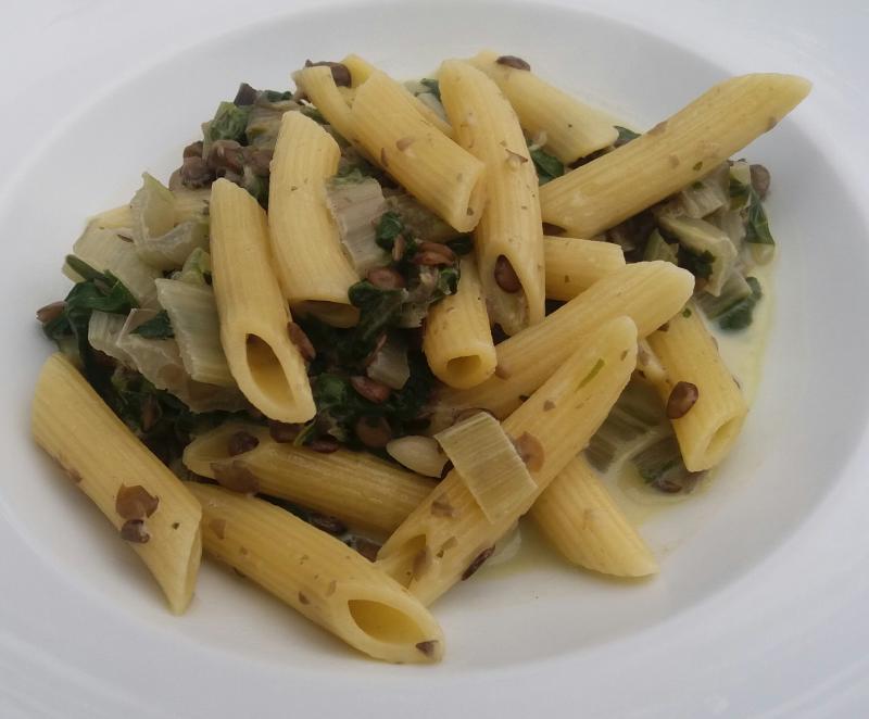 Heute gab es Penne mit Mangold und Linsen in Käsesoße.