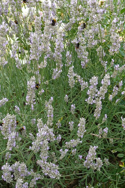 Lavandula angustifolia 'Hidcote Blue', 'Munstead', 'Contrast', 'Dwarf Blue', 'Imperial Gem', 'Royal Blue' sowie zwei weiße unbekannte Sorten. Außerdem gibt es noch einige Sorten, die bereits vor mehr als 15 Jahren gepflanzt wurden und die ich beim besten Willen nicht mehr identifizieren kann. Sie sind auch nie beschnitten worden und deshalb hoch, verwachsen und schütter. Beschneiden geht nicht mehr. Aber ich kann es nicht über Herz bringen, sie rauszunehmen. Allen neuen Pflanzen werden bei mir rigoros beschnitten, was durchweg erfolgreich ist.