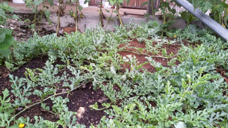 Apropos gekeimt, Mitte April haben exakt da wo diese Melonen jetzt wachsen wild eine Wassermelone sowie mehrere Zuckermelonen gekeimt. Extrem früh wie ich finde, vor allem fürs Freiland. Allerdings kam eine Woche später der Frost, das haben sie nicht überlebt.