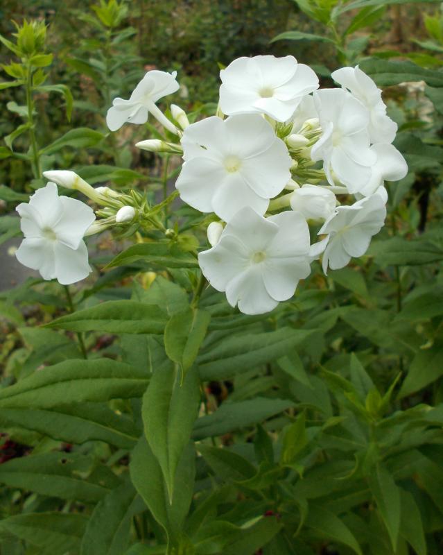 ... Hier steht seit vielen Jahren (mindestens seit den Endsiebzigern oder Frühachtzigern) dieser reinweiße Phlox – keine Ahnung, welche Sorte. Hält sich stabil, bleibt am sonnigen Standort kompakt und auch in feuchten Frühjahren unter einem Meter (dieses Jahr ziemlich deutlich drunter), wird am schattigen Standort (ich nehme an, es ist die gleiche Sorte – hier in der DDR-Provinz wird es kaum unterschiedliche Sorten reinweißen Phloxes gegeben haben ;)) aber durchaus mal anderthalb Meter hoch oder höher. Das Foto zeigt ein Exemplar am sonnigen Standort; möglicherweise kann einer der Experten eine Sortendiagnose abgeben?