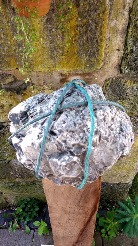 Es handelt sich um einen kugelförmigen, etwa Fußball-großen Flintstein, den ich vor zwei Jahren in der Ostsee fand. Ich habe ihn durch selbstgedrehte Kupferseile "gefesselt".
